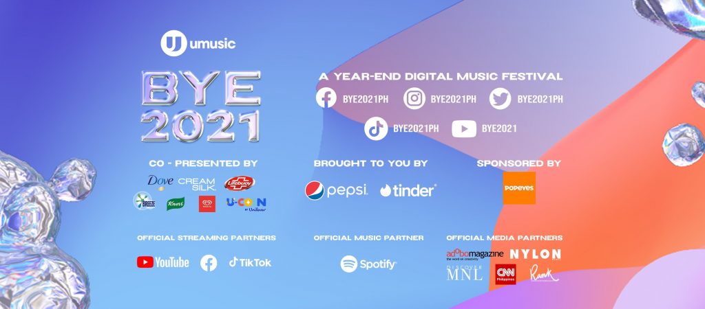 BYE2021 is co-presented by Dove Hair, Creamsilk, Lifebuoy, Dove Skin Cleansing, Breeze, Knorr, Selecta, and U-COIN by Unilever. This event is also brought to you by Pepsi, and Tinder; sponsored by Popeyes; with official streaming partners, YouTube, Facebook, and TikTok; and official music partner, Spotify.