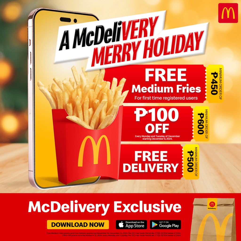 Just imagine: what could be more delightful during the hectic holiday season than knowing you’ve got some delicious McDonald’s meals to look forward to at the start of your week? McDelivery is sprinkling some festive fun with a sweet deal: Php 100 off any order of Php 600 and above. This yummy promo is a special thank you just for registered McDelivery users. So, if you haven’t signed up yet, now’s the perfect time to jump on board and dive into the holiday cheer.