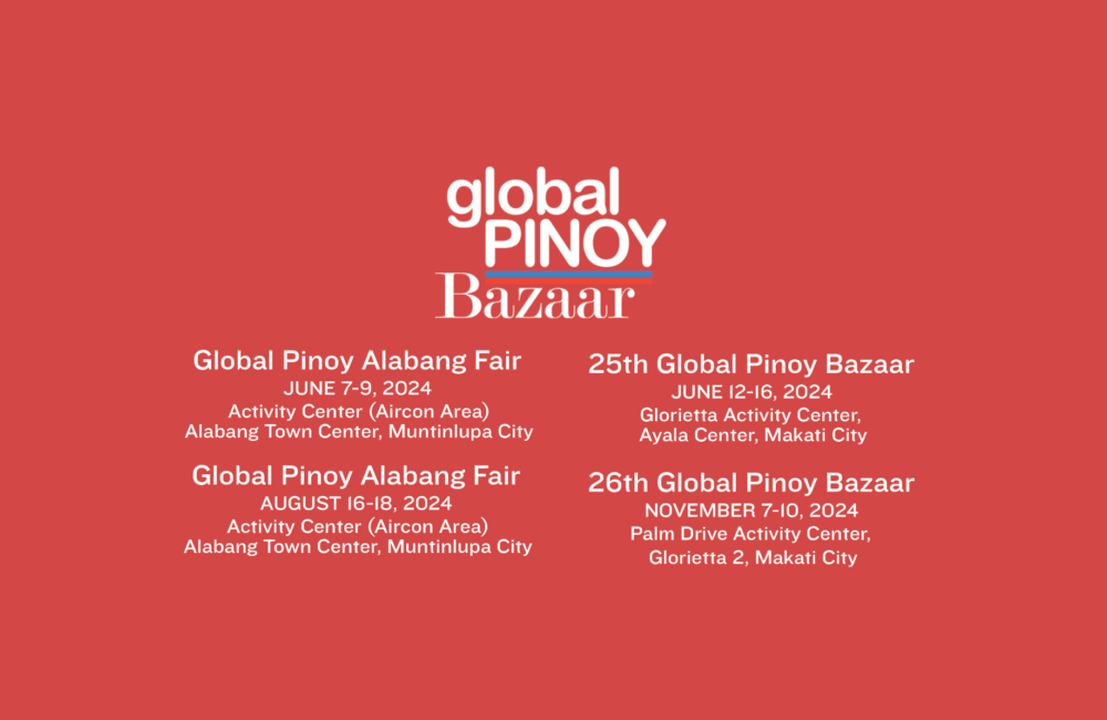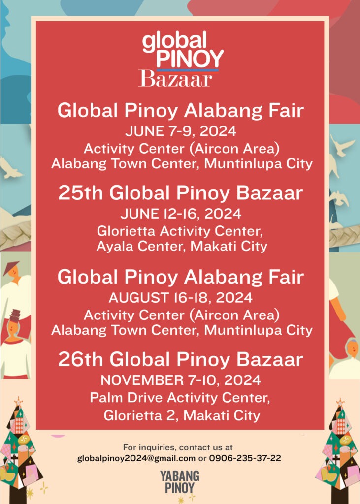 Meanwhile, the 25th and 26th GLOBAL PINOY BAZAARS, the biggest and the pioneering all-Filipino bazaar that brings forth the creativity and ingenuity of local brands close to the wider market, will be in Ayala Malls Glorietta in Makati City. These bazaars shall feature some of the local brands that we learn to love over the years and some of the recent and upbeat brands that are making a mark in the Philippine market. The 25th Global Pinoy Bazaar shall run from June 12-16, 2024 (Wednesday to Sunday) while the 26th Global Pinoy Bazaar Shall be held from November 7-10, 2024 (Thursday to Sunday). Instagram (@yabangpinoy) or reach us through e-mail at globalpinoy2024@gmail.com and mobile at 0906-2353722.